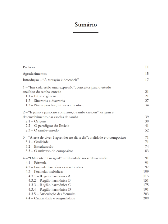 O autor analisa como certas estruturas musicais atravessam gerações e tendências estilísticas e estão presentes tanto em sambas considerados antológicos quanto em outros menos conhecidos. Dispondo de uma coletânea de mais de cem melodias, a obra estabelece uma visão panorâmica do samba-enredo e investiga o surgimento de tendências no gênero, o seu progressivo desuso e, sobretudo, a existência de estruturas que se mantêm constantes através do tempo.